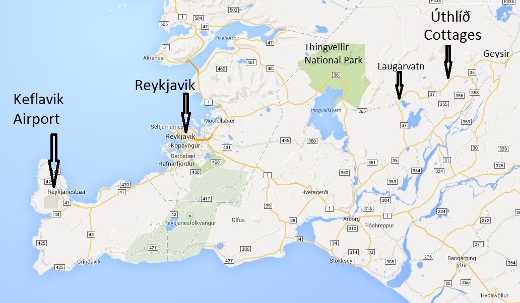 To Uthlid is about 100 km asphalt road from Reykjavik. Drive road nr 1. Then turn left road 35 before you arrive Selfoss. Then turn left road 37 via Laugarvatn.
